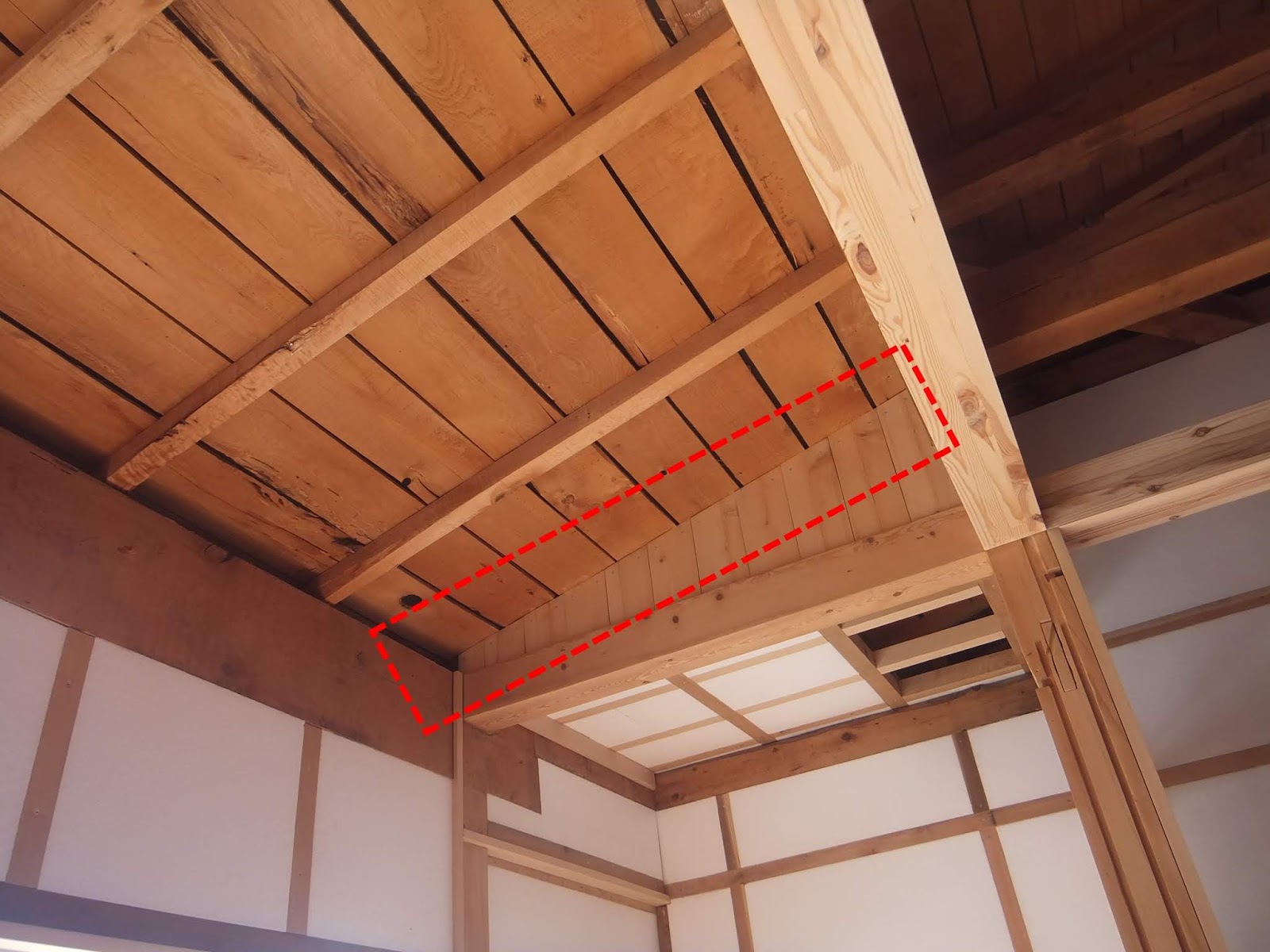 羽目板を取り付ける際に、裏に木がないと打ちつける事が出来ない為、端の方に設置する分を赤枠の所に準備します。ちなみに反対側は随分(ずいぶん)と前に準備済み。