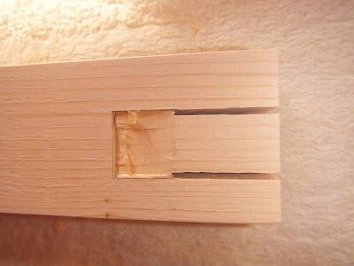 枠の基準となる手前と奥側に2箇所ずつ掘り込みを入れる為の罫書線を、上の写真の様に材料となる面を押し当て枠を書くことで、同じサイズの溝を作成する為の罫書線を引きました。